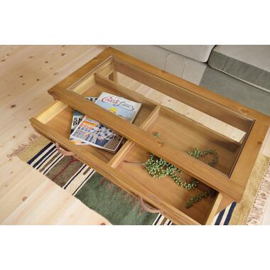 天板にガラスを使用しているので、引出しにしまったものが見えるコレクションテーブル。お気に入りのポストカードや雑貨を収納してディスプレイするのもよし、雑誌やリモコンをオシャレに収納するのもよしな万能テーブルです。引出しの下にすのこ状の棚もあるので、ティッシュなどを置くことができます。見た目以上収納力が高いテーブルです。