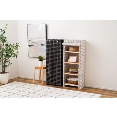 付属の工具ですぐに組立られる簡単組立シェルフ。ファブリックのカバーを外して、オープンシェルフとしても。