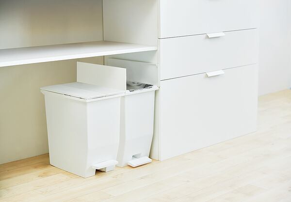棚下やカウンター下に置いたまま捨てられるコンパクトなペダルダストボックス。菌につよく、汚れにくい抗菌と防汚のダブル加工。