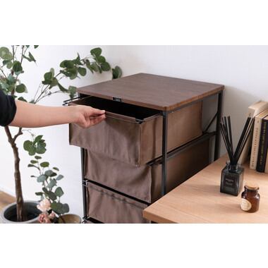 木目調天板と黒アイアン脚のキャンバスチェスト 4段 キャスター付き