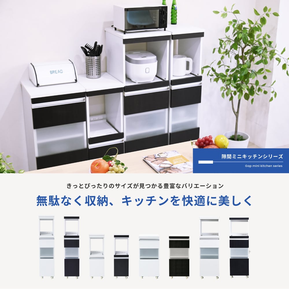 家電の収納に便利なコンセント付きスライド棚と、収納物に合わせて高さ調節ができる可動棚付きの食器棚をこれ1台で。ロータイプは天板も使いやすいちょうど良い高さ。キッチンのちょっとした隙間に設置すれば、それまでのデッドスペースを有効活用できます。