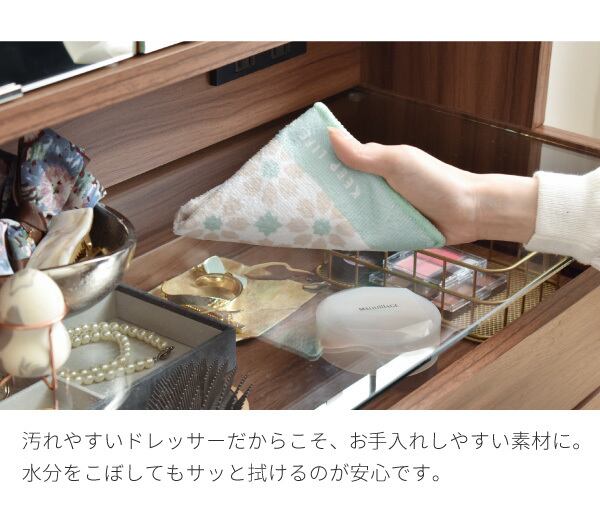 美しいガラストップが特徴的なロードレッサー。引き出しの中に入れたものが見えるので、化粧品を収納するだけで一層おしゃれに彩れます。ミラー内やサイドのラックなど収納スペースが豊富で、毎日のメイクやヘアアレンジもこれ一台あれば快適です。