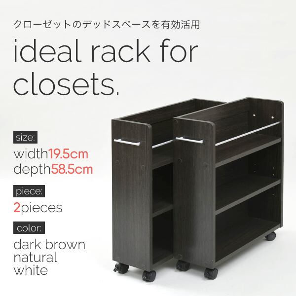 キャスター付きの便利なクローゼットラック2個組。取っ手はどちらにも取り付け可能なので、収納箇所の向きは左右入れ替えできます。本やメディア類や、日用品のストックなどの収納にぴったり。クローゼット内のスペースを有効活用するのでお部屋をすっきり片付けられます。