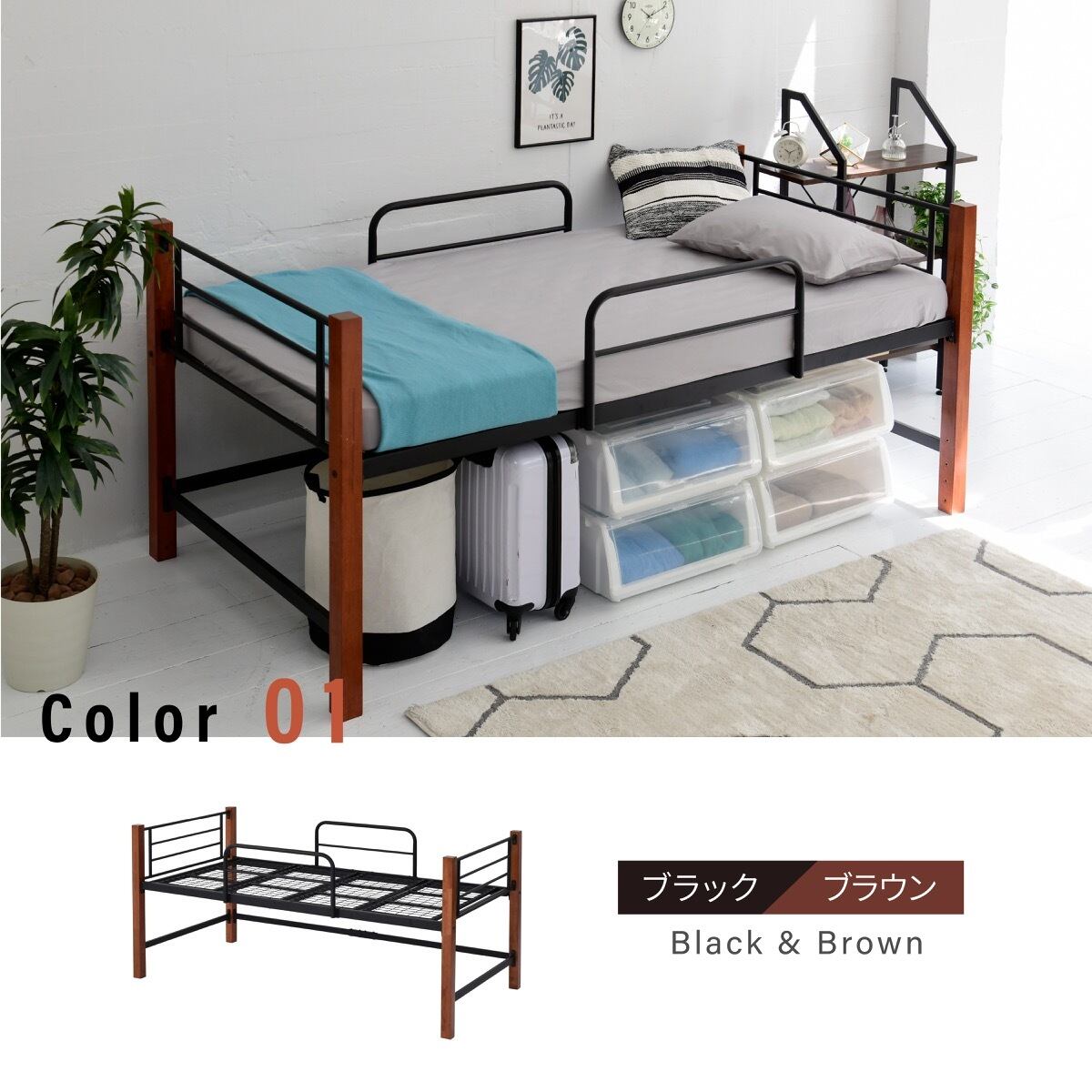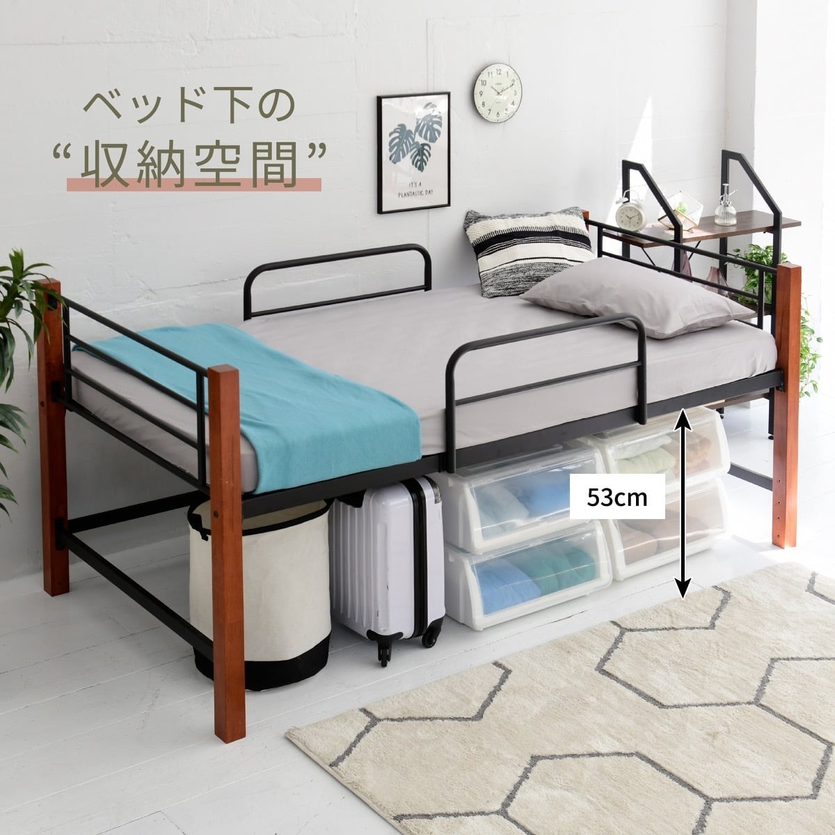 温かみのある天然木とクールなスチールのコントラストがおしゃれな、ちょっと高めのシングルベッド。ベッドの下の収納スペースがたっぷり確保されているので、衣類ケースなどもすっぽり収まります。お部屋の雰囲気にあわせて選べる4カラー展開が嬉しい!