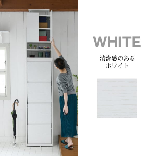 玄関の限られたスペースでも場所を取らない薄型設計のシューズボックス。扉がフラップ仕様になっており、玄関にあふれた靴をたっぷり収納できて見た目もスタイリッシュ。天井までの空間を有効活用できるハイタイプです。上段には靴だけでなく箱やお手入れ用品なども収納できて、これ1台で玄関がすっきり片付きます。