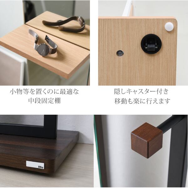 Ritaシリーズは熱や水に強く、傷がつきにくいので、メンテナンスが容易です。スチールは鋭角な部分を排除し、やさしい作りになっています。ハンガーフックや簡易ハンガーバー、小物を一時的に置いておくための棚付きなので簡易収納にも身だしなみを整えるのにも便利です。隠しキャスター付なので移動も楽々。