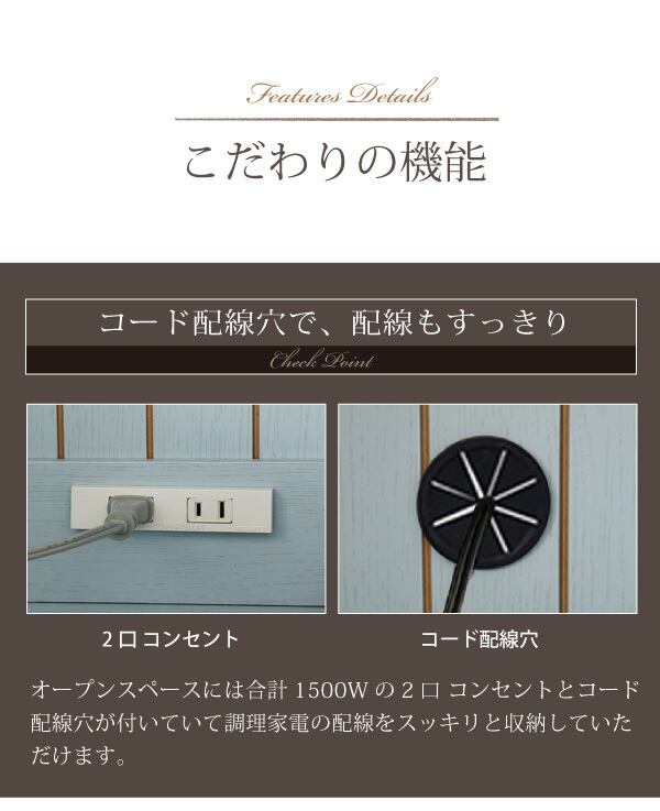 バイカラーで魅せるフレンチカントリースタイルのカップボード。コンパクトサイズなので一人暮らしにも最適。オープン部は2口コンセント付だから、トースターなどの調理家電の収納に便利。上段には、可動棚があるので、調味料などの小物収納に最適。下段は、引き出しと扉収納で、カトラリーから食器類をしっかり収納出来ます。丸みを帯びたフォルムと、アンティーク調の取っ手といったディテールがカントリーテイストを漂わせます。
