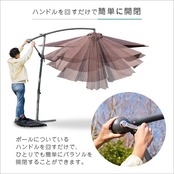 パラソルを固定するセイフティーロック付きで、ハンドルを回すだけで簡単に開閉。