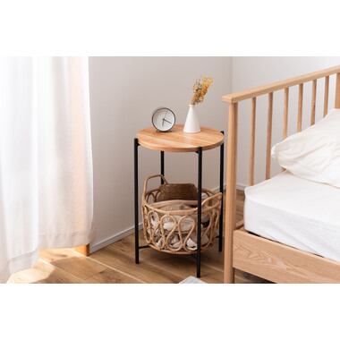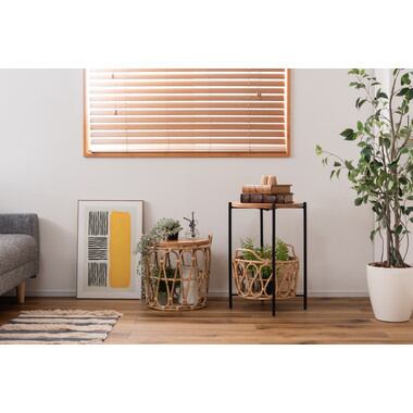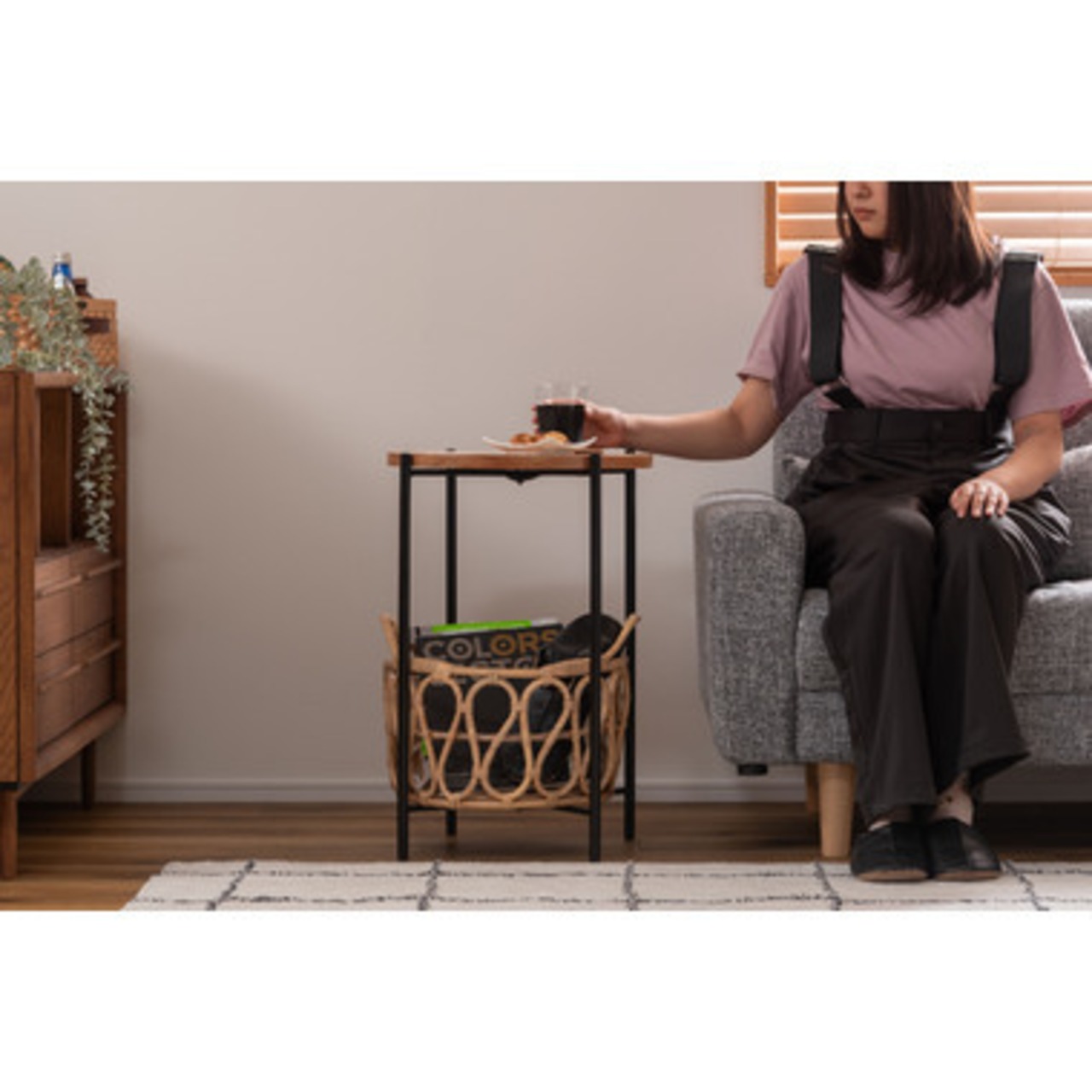 高級木材ミンディとラタンのバスケット付きサイドテーブル 北欧 ナチュラル リビングテーブル リビング