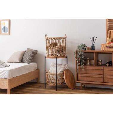 天板のウッドやバスケットのラタン素材があたたかさを演出しながら脚部にスチールを使用する事で引き締まった印象に。