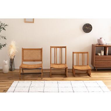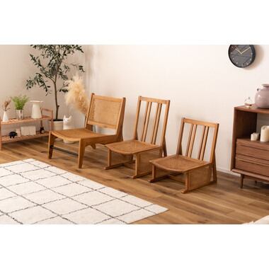 ラタンの編み模様と天然木の木目が美しいフロアチェアシリーズ。空間に合わせて選べる3タイプをご用意。