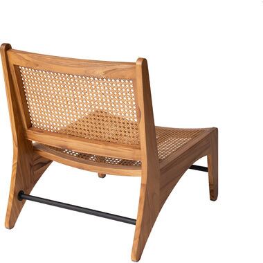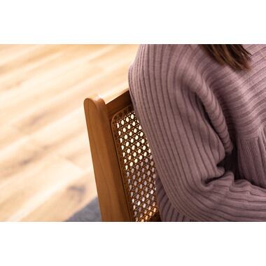 背もたれのカーブがしっかりと背中を支えてくれます。ゆるくカーブが掛かった座面で、座りやすい設計。フレームは高級木材の一つとされる天然木(チーク)を使用。味わい深くぬくもりのある質感です。光に当たると美しい模様が透けて出る、籐の網模様もこだわりポイント。