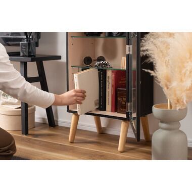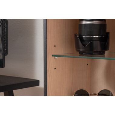 扉の本体側にマグネット受けがあるので、ピタッと扉を閉めることができます。棚は全部で3つ。一番上の棚は固定タイプ。2段目・3段目はガラス板を使い高さ調整が可能。それぞれ3段階の高さ調整ができます。ガラス板は5mm強化ガラスを使用しているので強度面も安心。