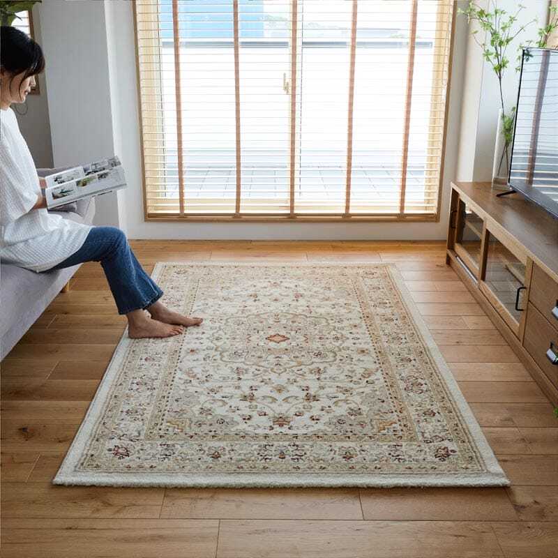 ペルシャ絨毯風のエレガントなデザイン。ヒートセット加工でしっとり柔らかな手触りのウィルトンラグです。