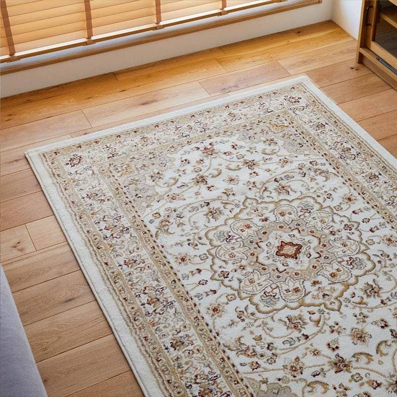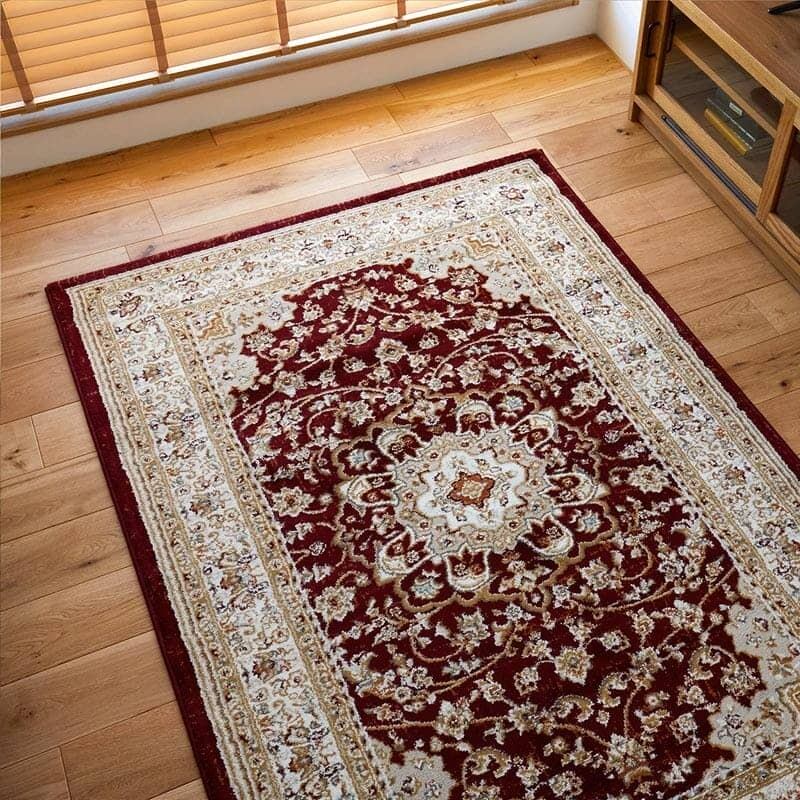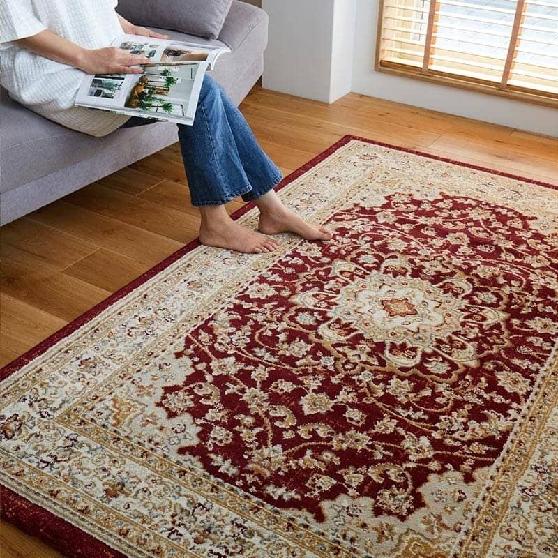 ペルシャ絨毯風のエレガントなデザイン。ヒートセット加工でしっとり柔らかな手触りのウィルトンラグです。