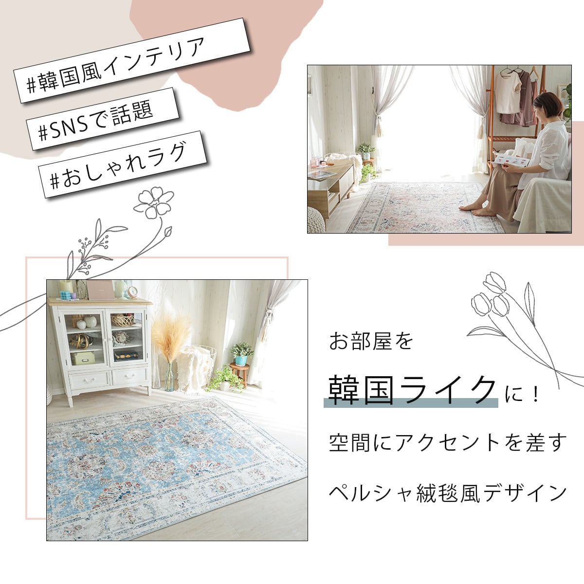 かすれ風プリントとくすみカラーで上品な華やかさのシャビーシックな空間へ。