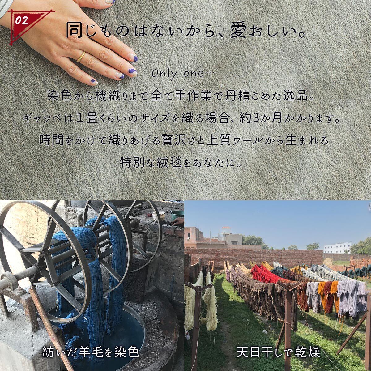 鮮やかな色合いと素朴な風合いが魅力的な、なめらかな肌触りと程よいボリューム感の天然羊毛インド製手織りギャッベです。